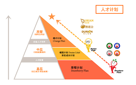 如有帮助员工树立职业发展目标、激发工作热情的“彩虹计划”:通过专业培训、师徒帮带、技能竞赛和轮岗锻炼以及岗位创新体系等提升其职业道德和行为素养的员工培育机制;如帮助年轻员工实现人生角色完美转变的“草莓计划”:通过草莓课程、草莓头脑风暴、草莓公益行动及草莓示范岗、草莓集体活动及草莓社团辅以导师制的日常指导等形式培养草莓的专业、创新、责任和激情四大品质;如覆盖了技术研发和管理两大后备人才职业发展通道的“榴莲会”:通过实施科研人才发展战略和管理培训及实战演练等方式,帮助员工找到最适合的自我发展途径,构成了人才培养体系中的核心环节。